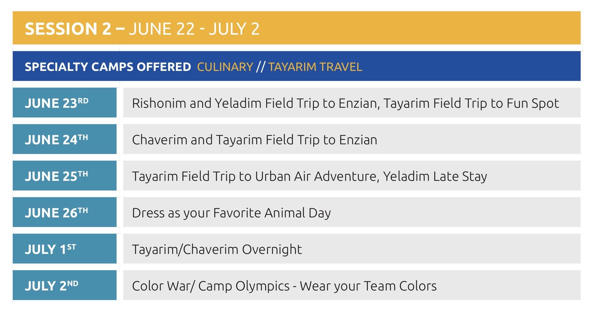 All traditional camps run in 2-week sessions.