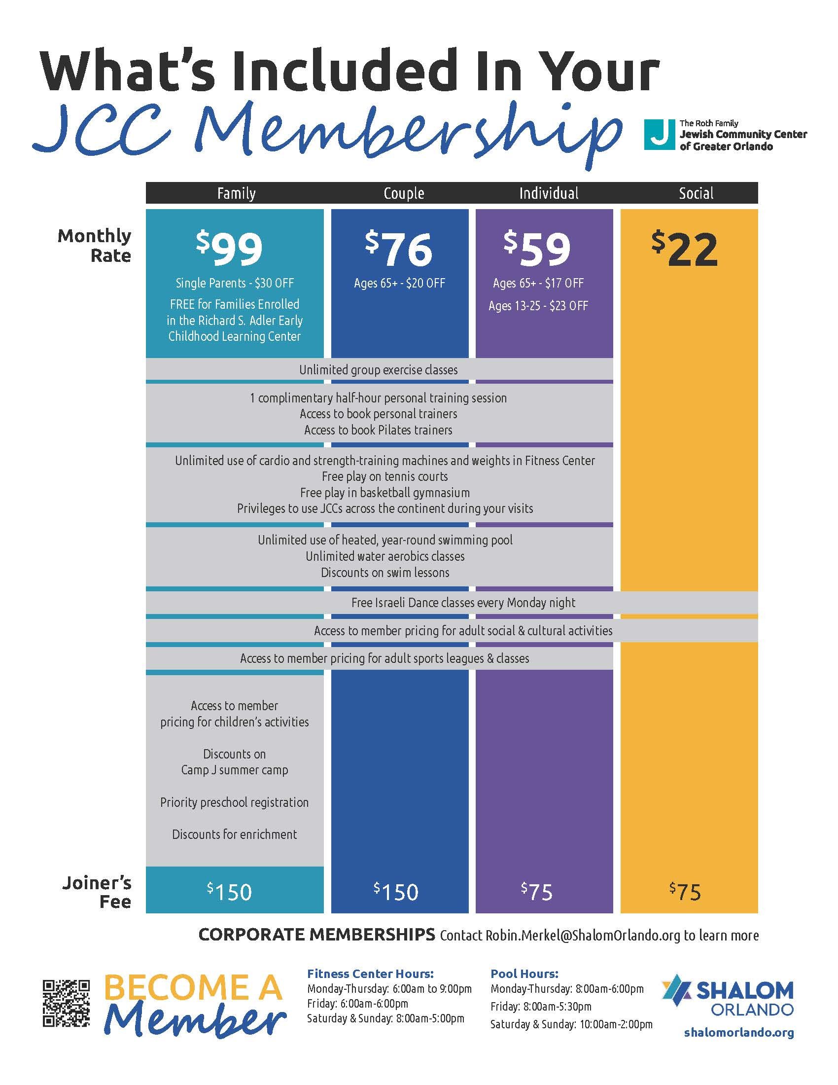 Fitness, Aquatics, Early-Childhood Education, Arts, Culture, Tennis, Family… and FUN! Shalom Orlando has it all with membership options for everyone.